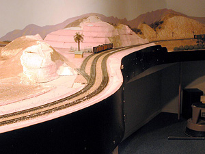 Foam panels were laid on top of spline and the contour traced with a pencil. Once cut, the foam was butted up against the spline and glued in place with hot glue. (Figure 5) The combination of hot glue and sheet rock screws made for extremely rapid construction. The pink foam, layered and sculpted with a rasp and saws (Figure 6) overlaid with plaster, soil and ground foam was a treat to work with. Bruce Petty created much of the plaster rock work.