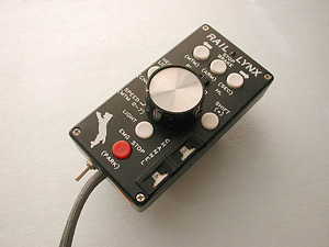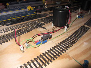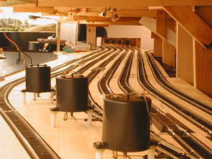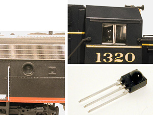 We use an infrared command control system supplied by Rail-Lynx. Rail-Lynx is a 255-channel infrared command control system which provides for cordless walk-around control with all data from the hand held unit being sent directly to the loco, with the track providing only DC power. The infrared sensors are mounted inside the locomotives, typically behind cab windows or portholes. MUing of locos is possible and locomotive addresses may be changed via the hand held controller. While Rail-Lynx does not support sound at present, we have found this to be a reliable, inexpensive and extremely simple system to use. All that is needed for a fully operational system is a transmitter and a sensor/receiver combination. No computer interface is required nor any of the many boosters, programming tracks, wireless controllers and other paraphernalia typically required for DCC, as no control signal passes through the rail.