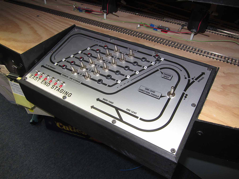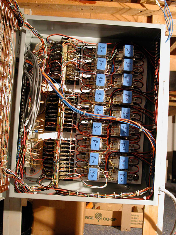 The East End Staging Yard complex is built inside a large return loop under the central peninsula. It has six tracks of equal length with power switches at each end. It is controlled by a diode matrix system with latching relays (Figure 1) designed and built by Rod Loder (Figure 2) which uses momentary contact toggle switches to set the route. Since this is a reversing section all staging tracks are isolated with floating polarity which is controlled automatically depending upon entrance and exit switch position. Power switches are moved by Switchmaster stall motors with Cherry E series snap action micro switches with extended actuating tab activated by the throw rod to show position (Figures 3 and 4). In operation, eastward trains move from L to K then enter the yard at switches A through E then exit westbound via switches F through J. The entire East End Staging Yard facility is on a separate circuit breaker. The system has been in operation since 2004 and performs flawlessly.