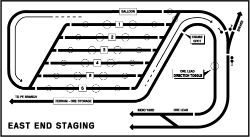 Over coffee one day Bruce Petty and I penciled an idea on a paper napkin which dispensed entirely with a staging yard with traditional ladder tracks and remote, difficult to reach, hidden switches. It was what amounted to a huge transfer table. Tracks could be longer, uniform in length, and there would be room for more of them.