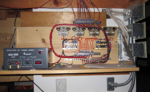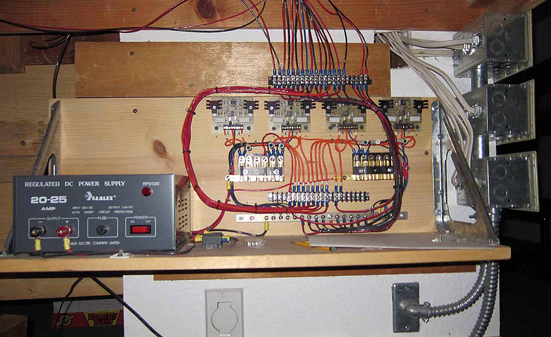 I was brought up in the Rod Loder school of bullet proof wiring. Power for the layout is supplied by a 20 amp commercial supply which feeds regulated 12 volt track power through five circuit breaker districts via 12 gauge solid copper wire buses that extend to every point on the layout. Rail joiners are for mechanical connections only. Every piece of track is hard wired with 18 gauge solid copper wire soldered to the web of the rail. All under table connections are made with 3M Scotch-Lock 567 and 568 "suitcase" connectors and in some cases wire nuts. No soldering was done under the table. All electrical gaps in the rail are filled with strip plastic and ACC glued in place.