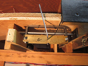 Positive positioning on each end is achieved by means of tapered 1/4" steel pins locking into holes drilled on flat indexing bars. 1/4" holes were drilled on two inch centers on 1/8" x 11/8" flat steel bars and bolted to 2x2's, one for each end of the tray. A tapered 1/4" steel rod, fitted in a U-shaped bracket, and operated manually, provides a positive lock at each end.