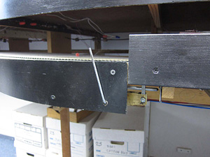 As built it is 16 feet by 18 inches underneath the layout on the east wall of the room. The table itself was made up from 5/8" cabinet grade 4x8 plywood sheets ripped length wise, trimmed and laid end-to-end. A 1x3 wood face plate was grooved to fit over the front edge of the plywood. This would provide rigidity, add a finishing touch and protect the trains on the tray. A sturdy gusset bolted in the middle allowed disassembly and movement of the various parts to the layout room.